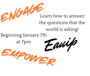 Have you ever wanted to talk about Jesus, but was afraid someone would ask a question that you couldn’t answer? Good news, every Wednesday beginning Jan 7th from 7-8 we are going to give you the answers that the world is asking. In 2026 we are going to teach you how to “engage” with others by “equipping” you with knowledge and then “empowering” you through the laying on of hands in Jesus’ name!